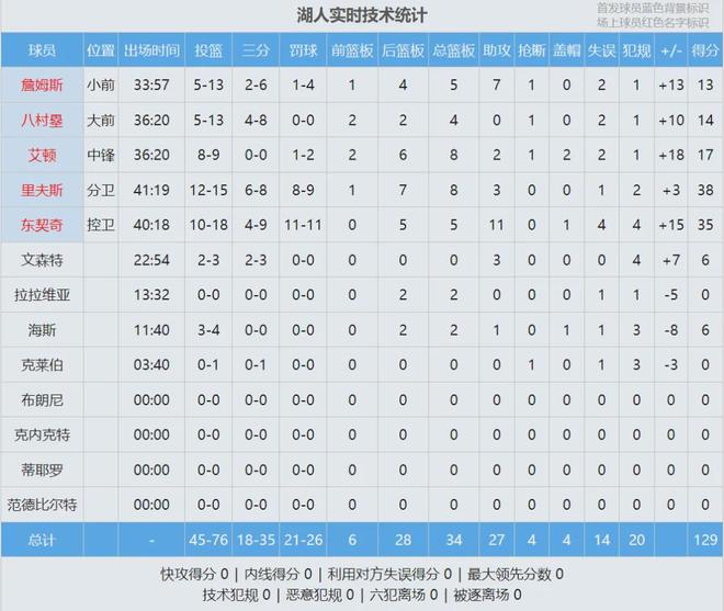 比赛还没结束,东契奇跟里夫斯已经联手砍下70+,独行侠匹配不上这种进攻强度。最后4分钟,湖人拉开到两位数。独行侠全队8人得分上双,已经尽力了,可惜缺少一个进攻大杀器。全场结束,湖人129-119战胜独行侠。